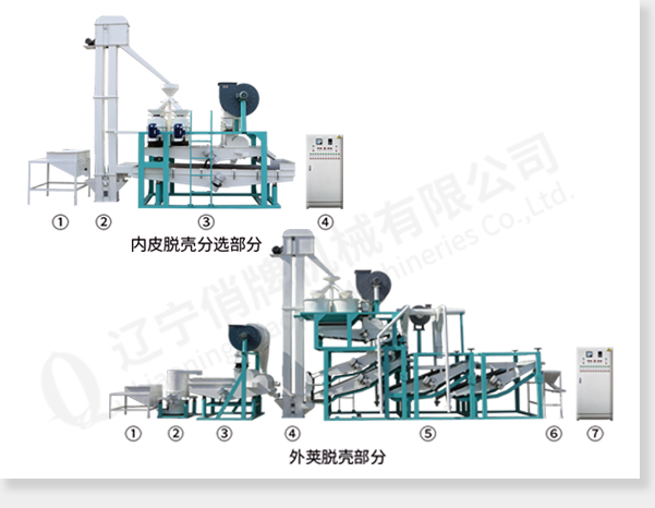 外莢脫殼部分:① 螺旋上料斗 ② 原料提升機(jī) ③ 多功能除雜機(jī) ④ 斗式提升機(jī) ⑤ 脫莢、風(fēng)選、分選設(shè)備 ⑥ 接料斗 ⑦ 電氣控制柜